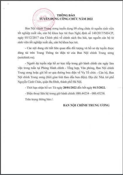 Ban Nội chính Trung ương thông báo tuyển dụng công chức năm 2022 từ nguồn sinh viên tốt nghiệp xuất sắc, cán bộ khoa học trẻ theo Nghị định số 140/2017/NĐ-CP ngày 05/12/2017 của Chính phủ